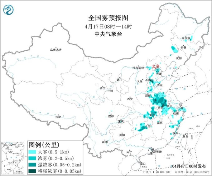 中国网4月17日讯 据中央气象台网站消息,气象监测显示,17日早晨,京津冀、山东、河南、安徽、湖北、湖南等多地出现大雾天气,上述部分地区有能见度不足200米的强浓雾。中央气象台17日早晨继续发布大雾黄色预警:预计17日早晨至上午,北京东南部、天津西部、河北中南部、河南北部和东部、安徽、湖北东部、湖南中部、浙江北部和东南部、福建东部等地部分地区有大雾,局地有能见度不足200米的强浓雾。建议驾车出行公众密切关注最新天气和交通信息,提前规划行程,行车谨慎慢行,注意保持安全车距。