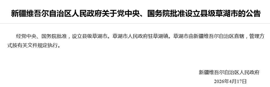 中国网4月17日讯 据新疆维吾尔自治区人民政府网消息,新疆维吾尔自治区人民政府17日发布:经党中央、国务院批准,设立县级草湖市。草湖市人民政府驻草湖镇。草湖市由新疆维吾尔自治区直辖,管理方式按有关文件规定执行。