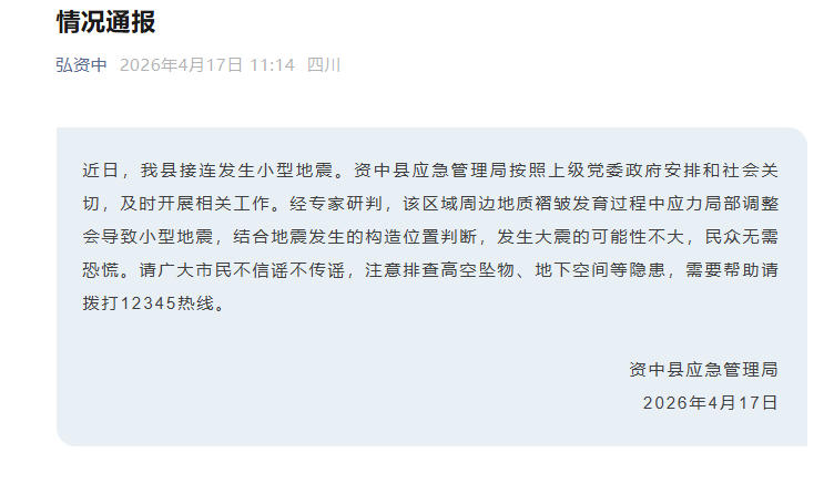 中国网4月17日讯 据“弘资中”微信公众号消息,四川内江市资中县应急管理局4月17日发布情况通报,近日,资中县接连发生小型地震。资中县应急管理局按照上级党委政府安排和社会关切,及时开展相关工作。