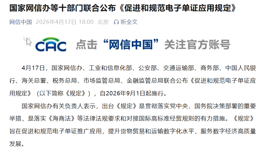 中国网4月17日讯 据网信中国微信公众号消息,4月17日,国家网信办、工业和信息化部、公安部、交通运输部、商务部、中国人民银行、海关总署、税务总局、市场监管总局、金融监管总局联合公布《促进和规范电子单证应用规定》(以下简称《规定》),自2026年9月1日起施行。