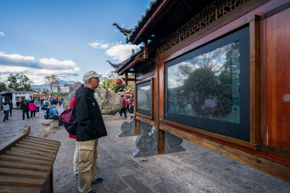 2024年3月23日,游客在丽江古城内查看电子导览大屏。云南省丽江市近年充分应用5G、物联网、大数据、人工智能等数字化技术,大力推动智慧旅游发展,提升服务水平和游玩体验,为当地文旅产业发展注入新活力。一砖一瓦皆文脉