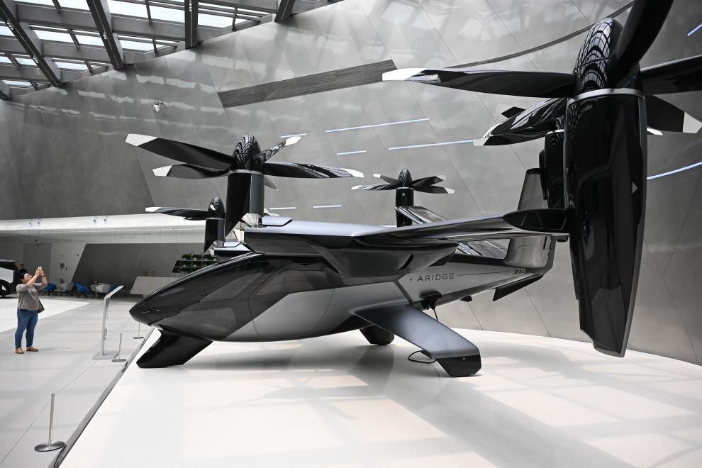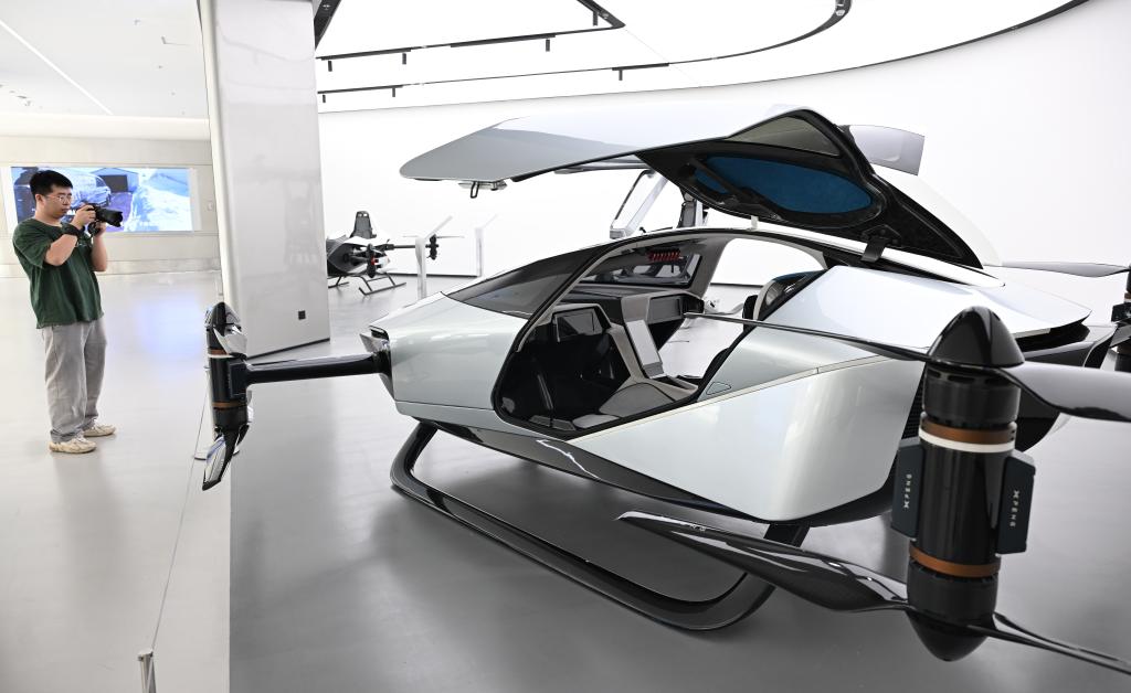 3月24日,在广州天河区的小鹏科技园,参观者拍摄全倾转混电飞行汽车。新华社记者 邓华 摄