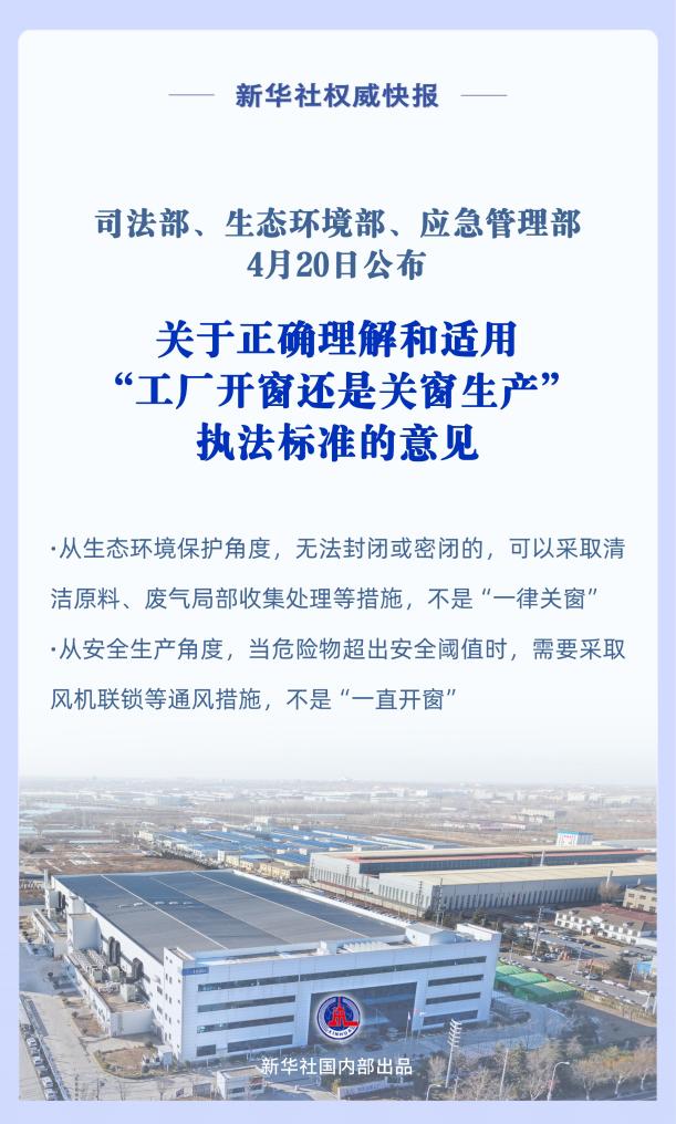 司法部、生态环境部、应急管理部4月20日公布关于正确理解和适用“工厂开窗还是关窗生产”执法标准的意见。