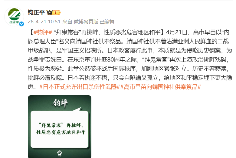 4月21日,高市早苗以“内阁总理大臣”名义向靖国神社供奉祭品。靖国神社供奉着沾满亚洲人民鲜血的二战甲级战犯,是军国主义招魂所。日本政客屡行此事,本质就是为侵略历史翻案,为战争罪责洗白。在东京审判开庭80周年之际,“拜鬼常客”再次上演政治挑衅戏码,性质极为恶劣。此举公然破坏战后国际秩序,加剧地区紧张对立。历史不容亵渎,挑衅必遭反噬。日本若执迷不悟,只会自陷道义孤立,给地区和平稳定埋下更大隐患。