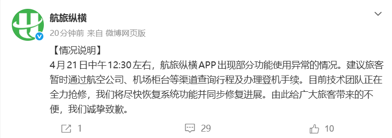 4月21日中午12:30左右,航旅纵横APP出现部分功能使用异常的情况。建议旅客暂时通过航空公司、机场柜台等渠道查询行程及办理登机手续。目前技术团队正在全力抢修,我们将尽快恢复系统功能并同步修复进展。由此给广大旅客带来的不便,我们诚挚致歉。