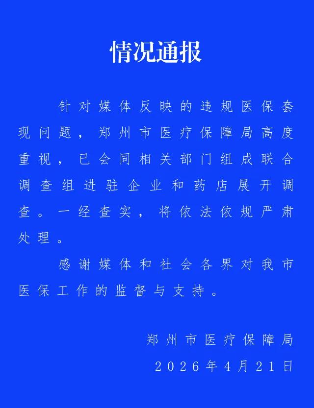 郑州市医疗保障局4月21日在官方微信公众号发布情况通报:针对媒体反映的违规医保套现问题,郑州市医疗保障局高度重视,已会同相关部门组成联合调查组进驻企业和药店展开调查。一经查实,将依法依规严肃处理。