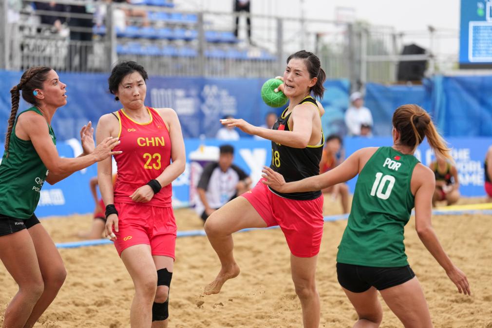 2025年8月,沈萍(右二)在2025年成都世运会沙滩手球女子预赛比赛中进攻。新华社记者 刘坤 摄