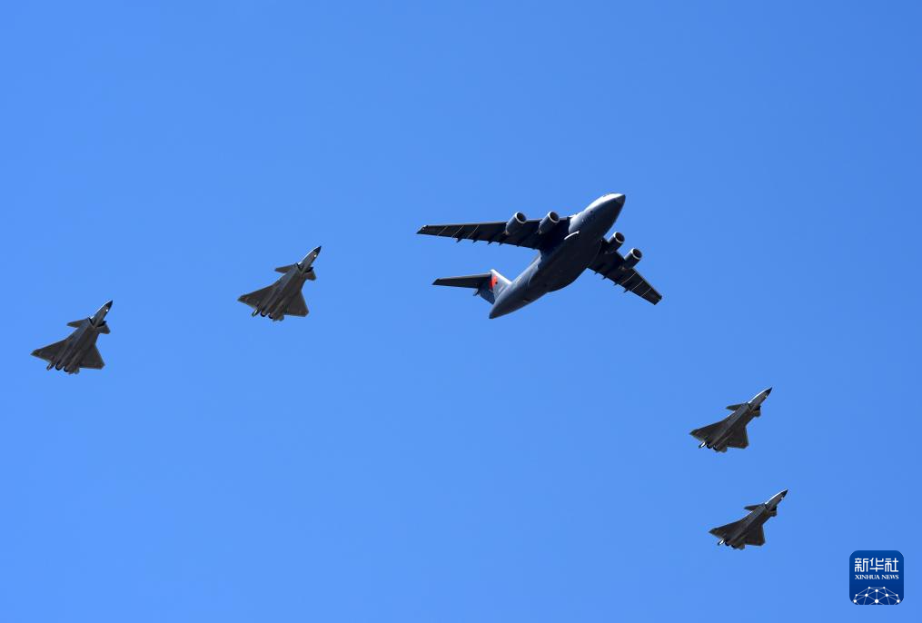 4月22日,第十三批在韩中国人民志愿军烈士遗骸回国。这是接迎第十三批在韩中国人民志愿军烈士遗骸回国的空军运-20B飞抵沈阳,4架歼-20战机护航。新华社记者 李钢 摄