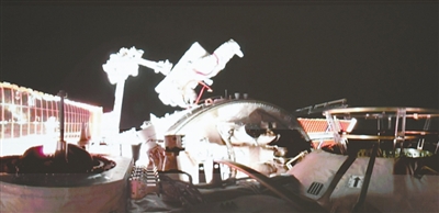 在北京航天飞行控制中心屏幕上拍摄的王杰出舱画面。新华社记者 厉彦辰摄