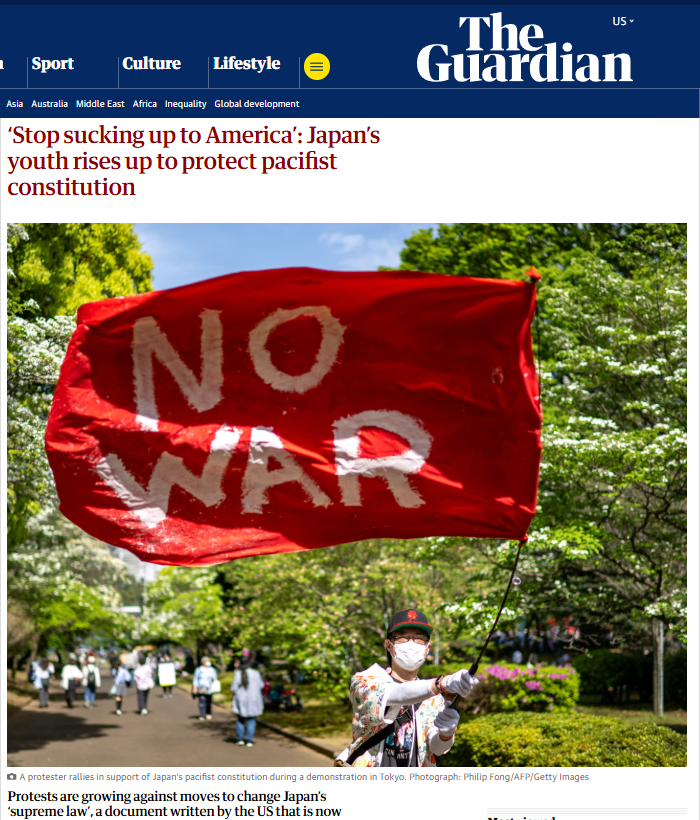 日本上智大学政治学教授中野晃一在文中分析,美国与以色列对伊朗的军事行动,以及美国总统对此反复无常的应对方式,已迫使日本年轻人发声。他指出:“这场战争让日本民众切身意识到,在高市早苗执政下,日本有可能介入一场非法的战争。因此,越来越多的人觉得,有必要表明他们对宪法第九条的支持,因为这是抵御战争的最后一道防线。”