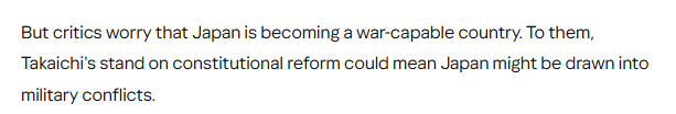 文章认为,日本首相高市早苗一直支持修改和平宪法。虽然她尚未明确说明具体修改内容,但许多人认为这将涉及修改放弃战争的宪法第九条。批评人士担心日本正朝着成为一个具备战争能力的国家迈进。高市早苗在宪法改革问题上的立场可能意味着日本将介入军事冲突。