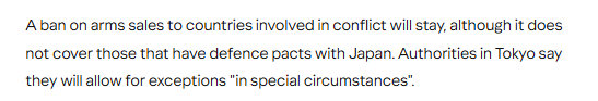 英国广播公司刊文认为,日本放宽了实施数十年的武器出口限制,为向十余个国家出售武器铺平了道路。这一决定,标志着日本背离其战后防卫政策中一贯的和平主义立场,是一个重要转折点。