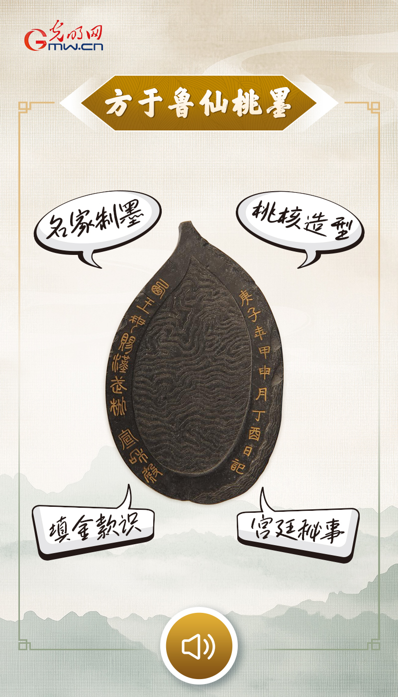 “以桃核为形,以云纹为衣,以填金篆隶为记,我是明代制墨名家方于鲁的仙桃墨。墨面镌刻‘西王母赐汉武桃’的仙话典故,背面更记录了元内库藏桃、洪武朝御赏的宫廷旧事,每一笔款识,都藏着一段流传的故事。松烟凝就我的骨血,匠心刻下我的纹路,文人以我研磨,挥毫写下锦绣文章,也将这千年传说与皇家雅事,一同藏进了墨香里。数百年过去,我依然带着松烟的清香,静静诉说着明代制墨的巅峰匠心,也守护着这一锭墨里的文化温度。”