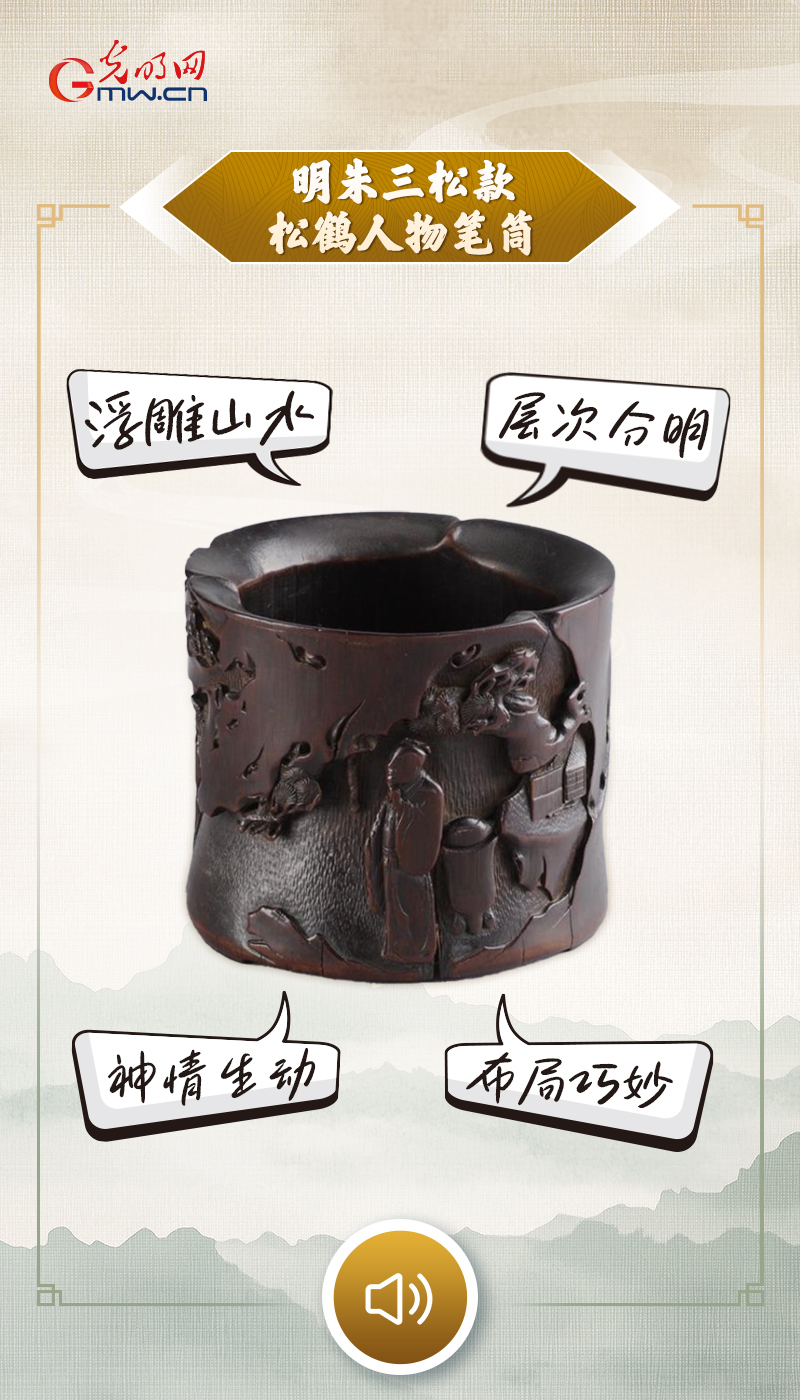 “以翠竹为身,以刀笔为魂,我是明代竹刻名家朱三松亲手所制的笔筒。深山松影下,高士悠然远眺,童子嬉戏喂雀,茶炉生烟,书卷静候,一刀一刻都藏着文人向往的山居闲情。岁月虽磨去竹色,却留得风雅长存,我以方寸之身,盛起笔墨春秋,也藏尽明代文人的清雅意趣。”