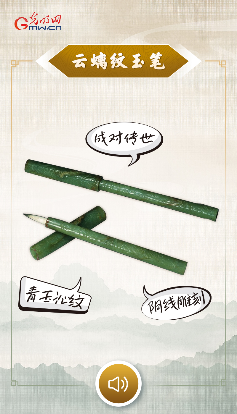 “青玉凝就笔管,螭龙穿梭云间,我是明代难得一见的成对玉笔。刀笔苍劲,线条细密,螭龙在流云里若隐若现,带着先民对祥瑞与文运的祈愿。我曾被文人握在手中,以温润玉骨,承起浓淡墨色,写下锦绣文章,也见证过无数伏案苦读的日夜。如今笔锋虽不再染墨,我身上的螭龙与云纹,依然守护着一脉流传千年的书香。”