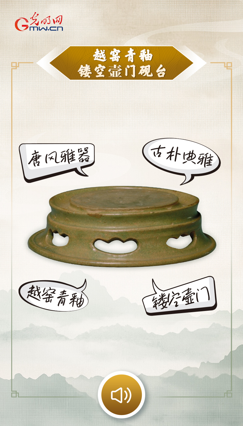 越窑青釉镂空壸(kǔn)门砚台现藏于故宫博物院,唐代,高3.9厘米,口径16.6厘米,足径13.4厘米。