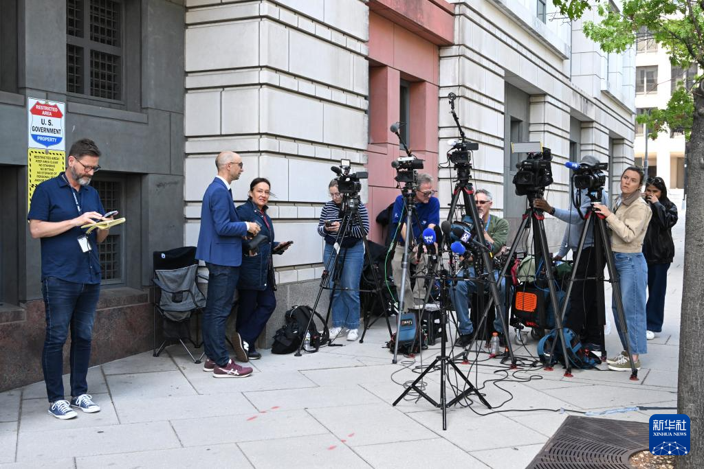 4月27日,在美国首都华盛顿,媒体记者在美国哥伦比亚特区联邦地区法院附近守候。新华社记者 李睿 摄