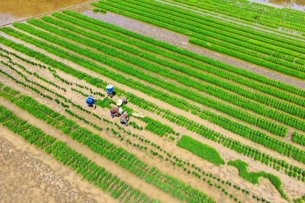4月18日,农户在重庆市合川区渭沱镇田间检查育秧情况(无人机照片)。新华社记者 唐奕 摄
