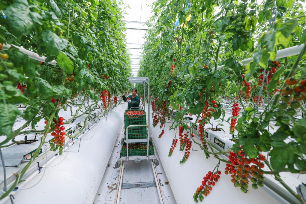 村民在位于浙江嘉兴海宁黄湾镇的浙江光禾智谷生态农业有限公司玻璃温室内采摘番茄(4月15日摄)。新华社记者 徐昱 摄