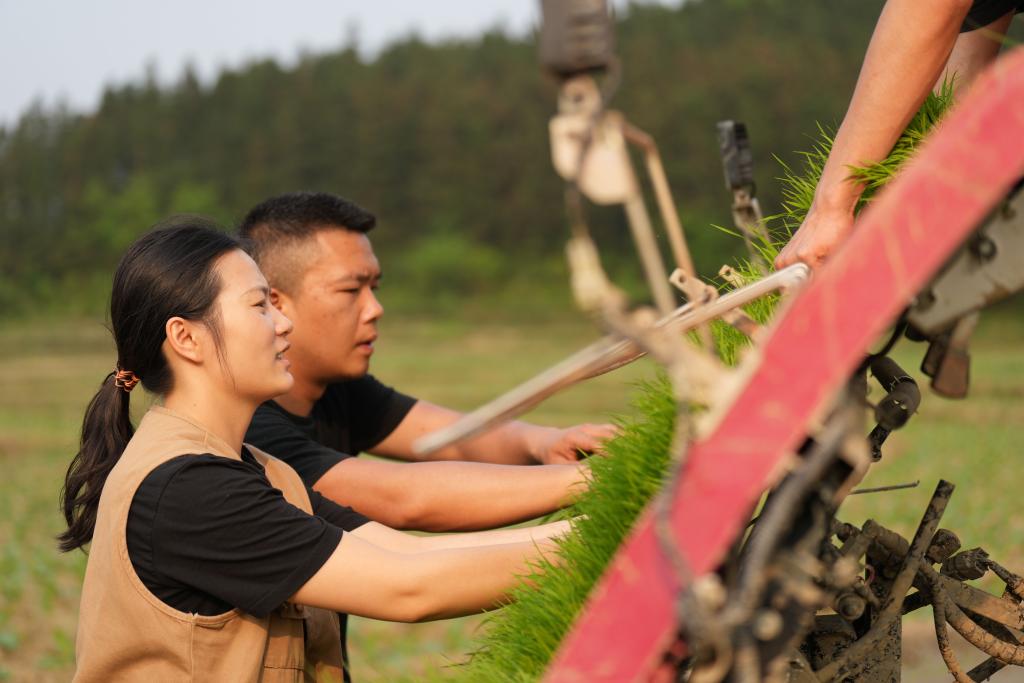 4月9日,“95后”新农人骆雨和丈夫江茂智在田间为插秧机装载秧苗。新华社记者 薛宇舸 摄