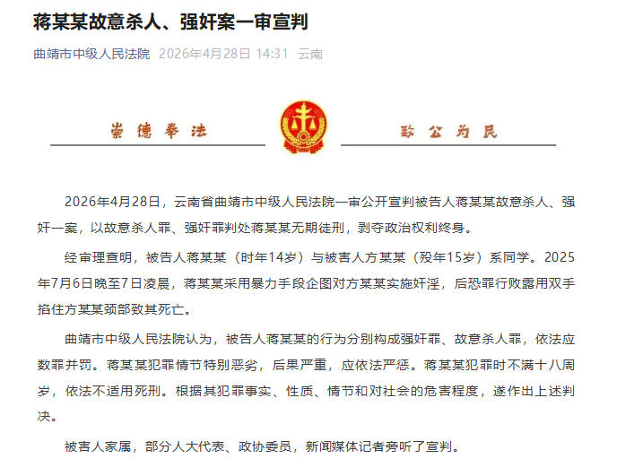 中国网4月29日讯 据云南省曲靖市中级人民法院官方微信消息,4月28日,云南省曲靖市中级人民法院一审公开宣判被告人蒋某某故意杀人、强奸一案,以故意杀人罪、强奸罪判处蒋某某无期徒刑,剥夺政治权利终身。