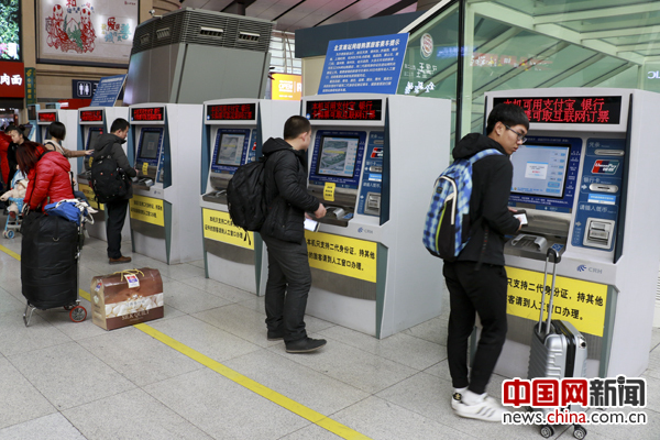 旅客在北京南站二楼候车大厅内的自助购票机前购票。中国网记者 郭永国 摄