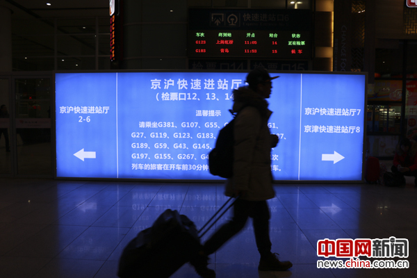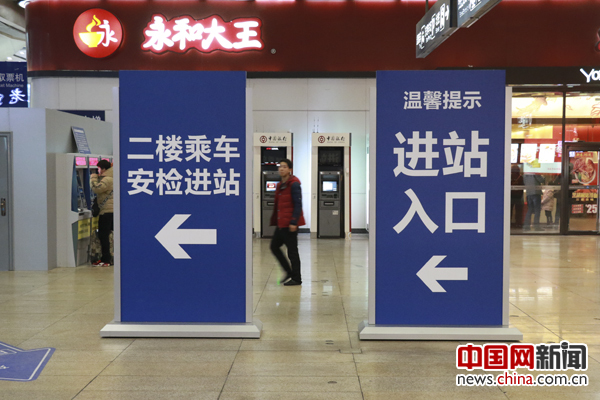 旅客在北京南站地下一层快速进站口指示牌前经过。中国网记者 郭永国 摄