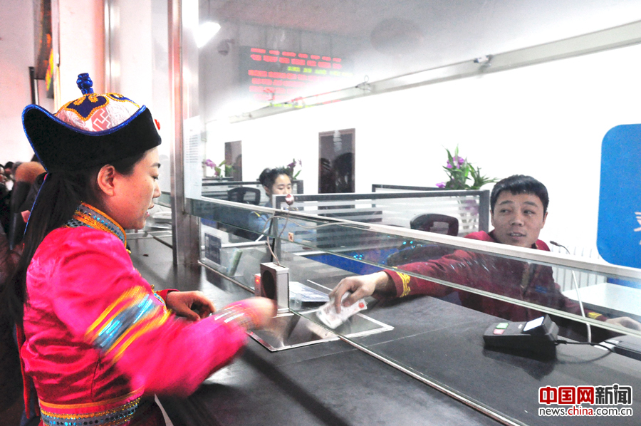 通辽火车站蒙汉双语售票窗口工作人员为蒙古族旅客售票。