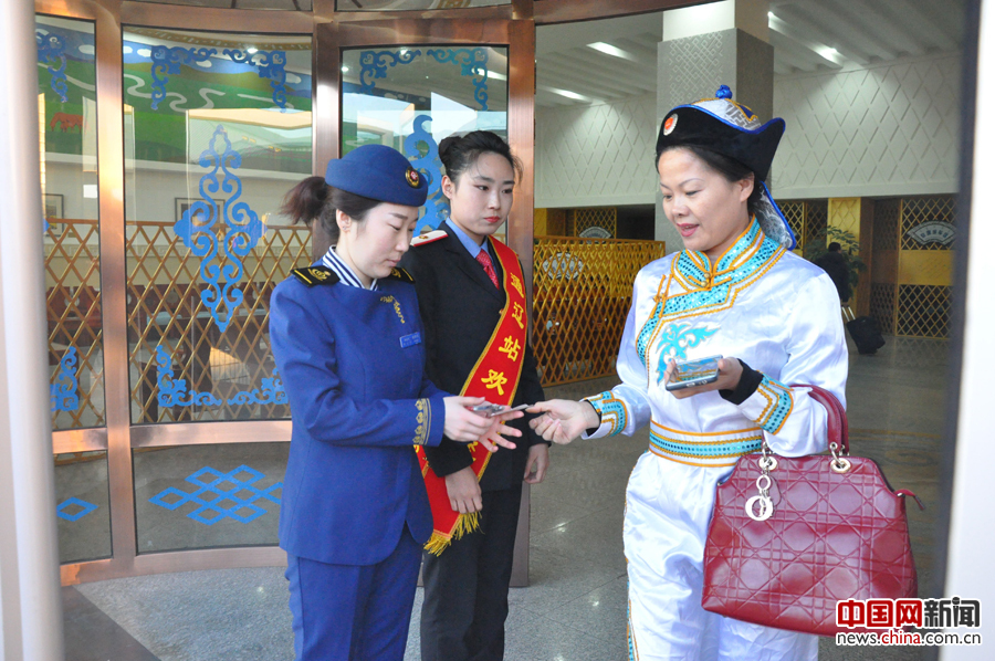 客运工作人员正在为蒙古族旅客检票。