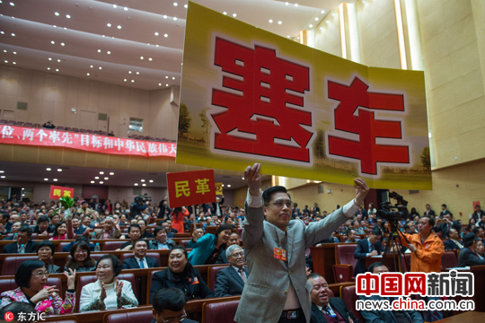 2017年1月18日,广东广州。政协第十一届广东省委员会第五次会议进入大会发言议程,一位政协委员为争取发言机会,将写有“塞车”二字的牌子高举过头。