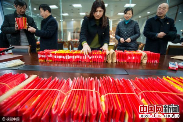 "年终奖"成热议话题 "彩票"等奇葩奖让人哭笑不得 01月23日,江苏省南通市,中国建设银行江苏海安支行员工加班加点,为当地建筑施工企业工人分装年终工资和奖金钱袋。图片来源:CFP