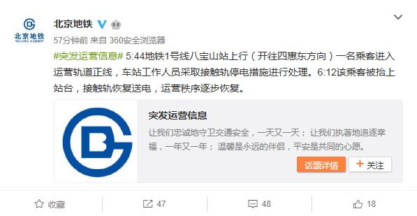 中国网1月25日讯 据北京地铁官方微博发布的消息,1月25日5:44北京地铁1号线八宝山站上行(开往四惠东方向)一名乘客进入运营轨道正线,车站工作人员采取接触轨停电措施进行处理。