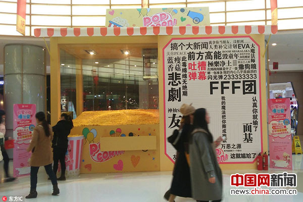 2017年2月11日,安徽合肥,为了给情人节营造氛围,蜀山区辖区一商场内设置了一个4米高的巨型爆米花机,爆出的米花随便吃吸引了不少顾客。图片来源:东方IC