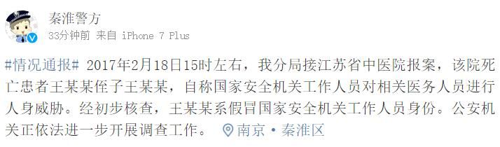 中国网2月19日讯 据秦淮警方微博消息,2月19日晚,南京秦淮警方回应“网传江苏省中医院医生被威胁”一事,称2017年2月18日15时左右,秦淮分局接江苏省中医院报案,该院死亡患者王某某侄子王某某,自称国家安全机关工作人员对相关医务人员进行人身威胁。经初步核查,王某某系假冒国家安全机关工作人员身份。公安机关正依法进一步开展调查工作。