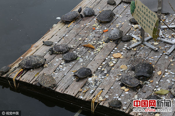 2017年2月10日,福建厦门,南普陀寺的放生池被游客扔进大量钱币。图片来源:视觉中国