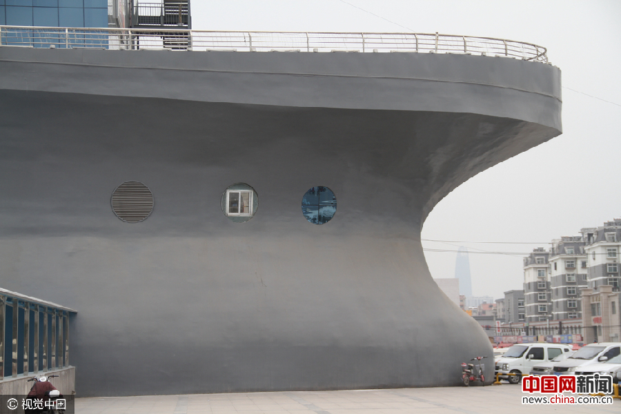 2017年2月21日,在山东济南小清河东路上,一大楼外形酷似巨型“轮船”开上大街,吸引众多路人的眼球。