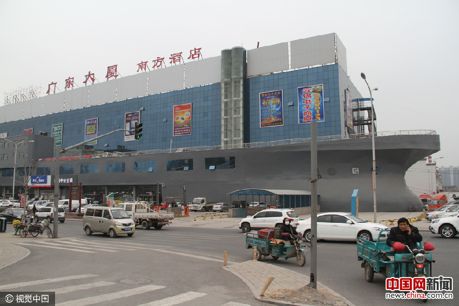 2017年2月21日,在山东济南小清河东路上,一大楼外形酷似巨型“轮船”开上大街,吸引众多路人的眼球。