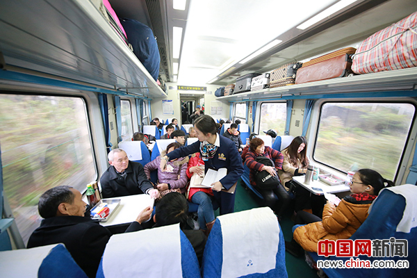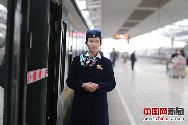 2017年2月23日上午10点18分,由成都铁路局重庆客运段北京车队担任值乘任务的T10次旅客列车上,7号车厢列车员邢鐘月正在车门口验票迎接旅客上车。