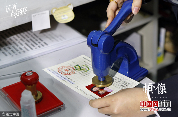 2014年3月5日,西安市发放首张单独二孩生育证。 西安市未央区党务政务服务中心,人口计生部门工作人员在即将颁出的首张“单独二孩”生育证上盖章。 视觉中国