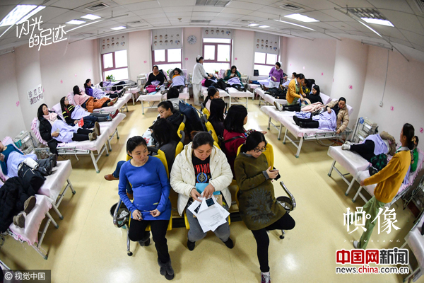 2017年2月,南京。胎心监测病房内许多孕妇正在进行胎心检查,其中近一半是二胎产妇。视觉中国
