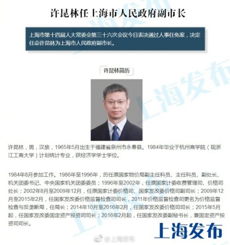 许昆林任上海市人民政府副市长(图/简历)