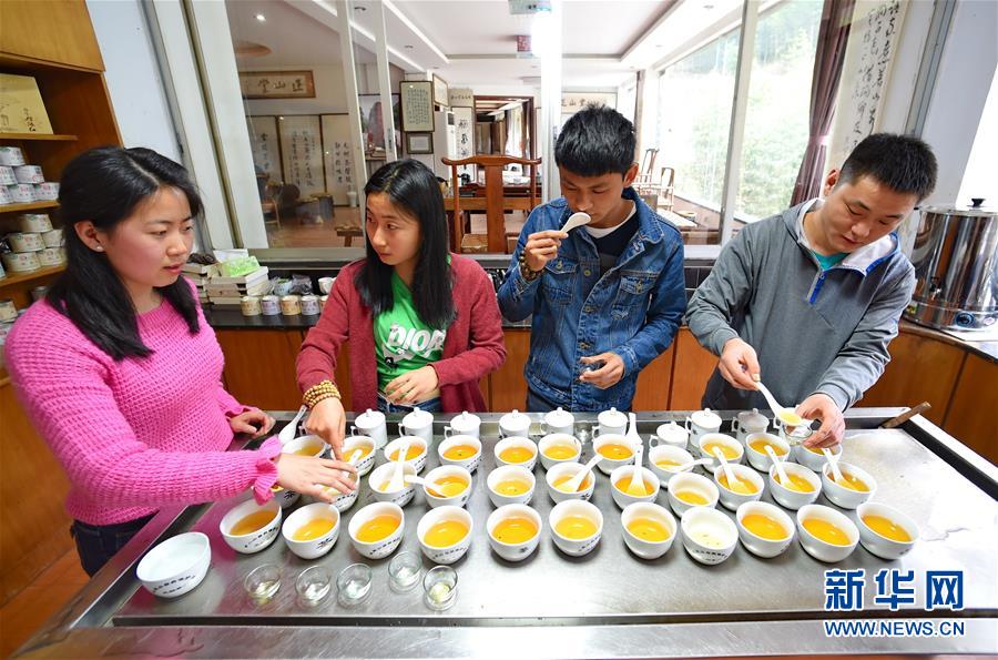 游客(左二、左三)在武夷山桐木村品饮“金骏眉”等红茶(4月15日摄)。福建武夷山是“万里茶道”的源头,有着400多年红茶生产历史,其主产区位于武夷山自然保护区境内的桐木村。近年来,当地茶人在传承古老制作工艺的基础上不断创新,“金骏眉”就是武夷山红茶工艺创新中的代表产品,其采用野生小叶种茶的芽尖制作,茶叶外形细长如眉,茶汤色泽金黄透亮,香气幽雅,滋味甘清,深受消费者欢迎。新华社记者姜克红 摄