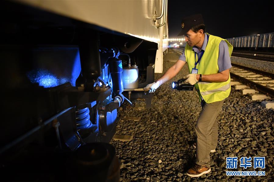 4月13日,在肯尼亚蒙内铁路内罗毕站,中方技术人员许景林进行当日测试运行后的检查工作。 新华社记者 孙瑞博 摄