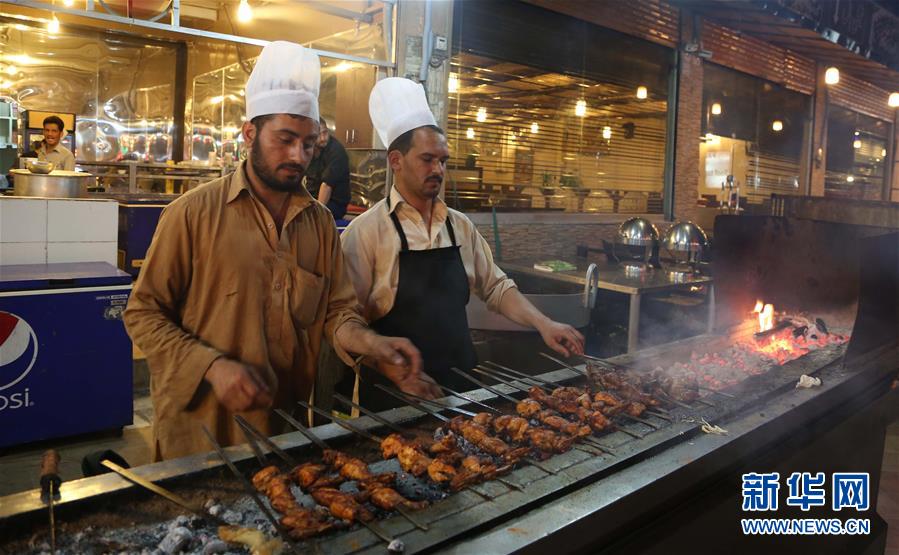 4月2日,在巴基斯坦拉瓦尔品第的一条美食街上,厨师在烤制鸡肉串和羊肉串。巴基斯坦菜肴大多采用炖、炸、烤等烹饪方法,味道香辣,肉类以牛羊肉和鸡肉为主,常见蔬菜则有洋葱、青椒、西红柿、白菜、茄子、生菜、菠菜、豆类等。新华社发(艾哈迈德·卡迈勒摄)
