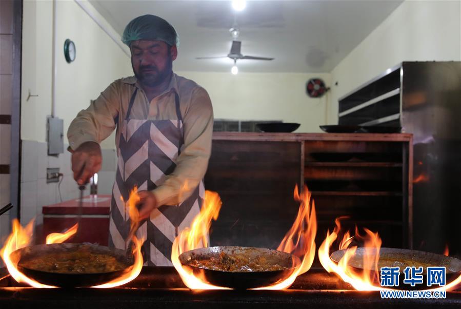 4月2日,在巴基斯坦拉瓦尔品第的一条美食街上,厨师在烹饪“铁锅羊肉”。“铁锅羊肉”通常与馕一起食用,是巴基斯坦人餐桌上常见的一道菜。巴基斯坦菜肴大多采用炖、炸、烤等烹饪方法,味道香辣,肉类以牛羊肉和鸡肉为主,常见蔬菜则有洋葱、青椒、西红柿、白菜、茄子、生菜、菠菜、豆类等。新华社发(艾哈迈德·卡迈勒摄)