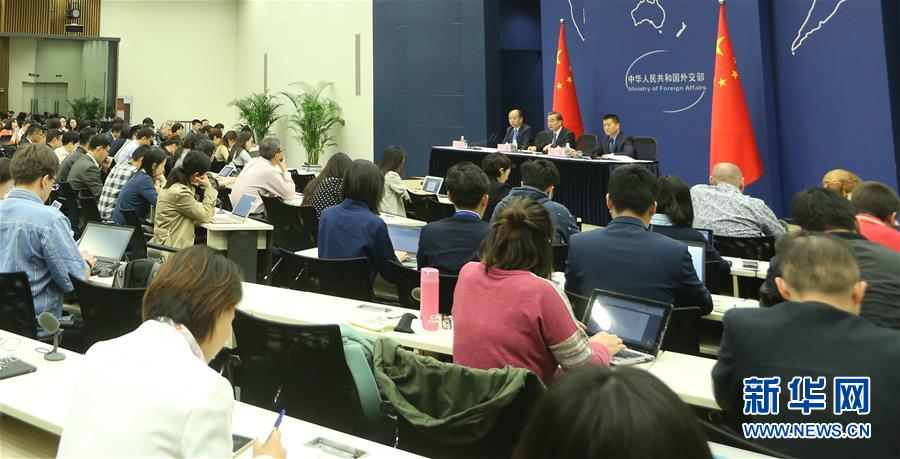 4月18日,外交部举行中外媒体吹风会。外交部长王毅、国家发展改革委副主任王晓涛分别介绍举办“一带一路”国际合作高峰论坛系列活动有关情况,并回答记者提问。王毅表示,“一带一路”国际合作高峰论坛将于5月14日至15日在北京举行,习近平主席将出席论坛开幕式并主持领导人圆桌峰会。应习近平主席邀请,目前28个国家元首和政府首脑确认出席论坛。新华社记者邢广利摄