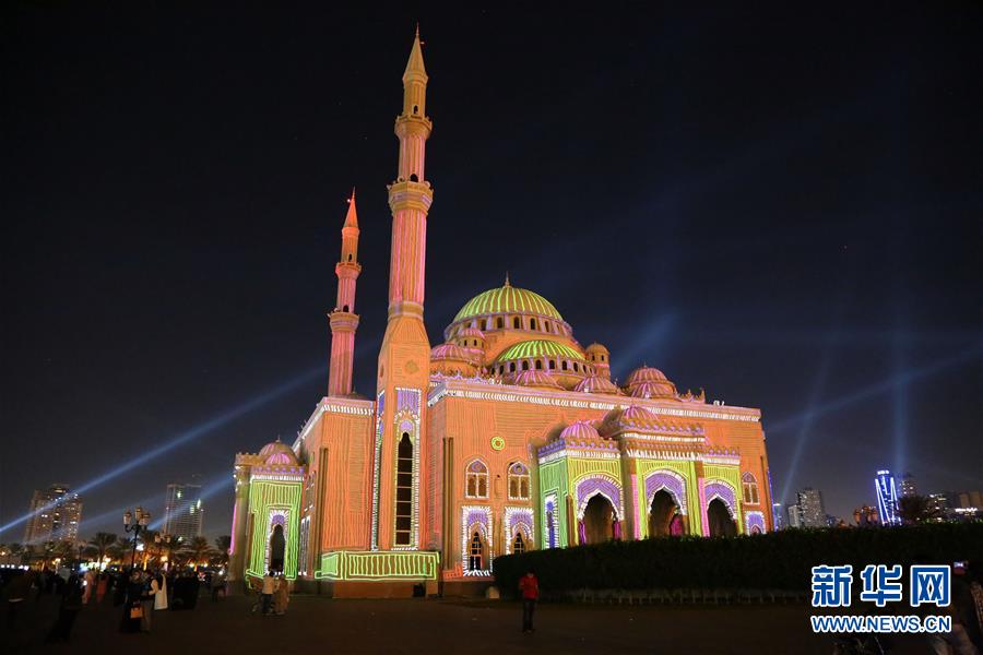 2016年2月5日,阿联酋沙迦酋长国的努尔清真寺在灯光节期间亮起彩灯。中东地区连接着东西方文明,有着悠久的历史文化和美丽的自然风光,是古丝绸之路的重要组成部分。中国的丝绸、瓷器和茶叶经中东销往欧洲。阿联酋位于中东地区的阿拉伯半岛,地处“一带一路”交汇地带,是中国推进“一带一路”倡议的重要合作伙伴。 新华社发(张澍民摄)