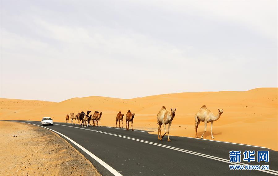 这是2016年5月6日拍摄的阿联酋的利瓦沙漠公路上的驼队。位于阿联酋首都阿布扎比西南约240公里的利瓦沙漠是世界上面积最大、受人迹侵扰最小的连续沙漠之一,拥有连绵起伏的壮美沙丘。中东地区连接着东西方文明,有着悠久的历史文化和美丽的自然风光,是古丝绸之路的重要组成部分。中国的丝绸、瓷器和茶叶经中东销往欧洲。阿联酋位于中东地区的阿拉伯半岛,地处“一带一路”交汇地带,是中国推进“一带一路”倡议的重要合作伙伴。 新华社记者李震摄