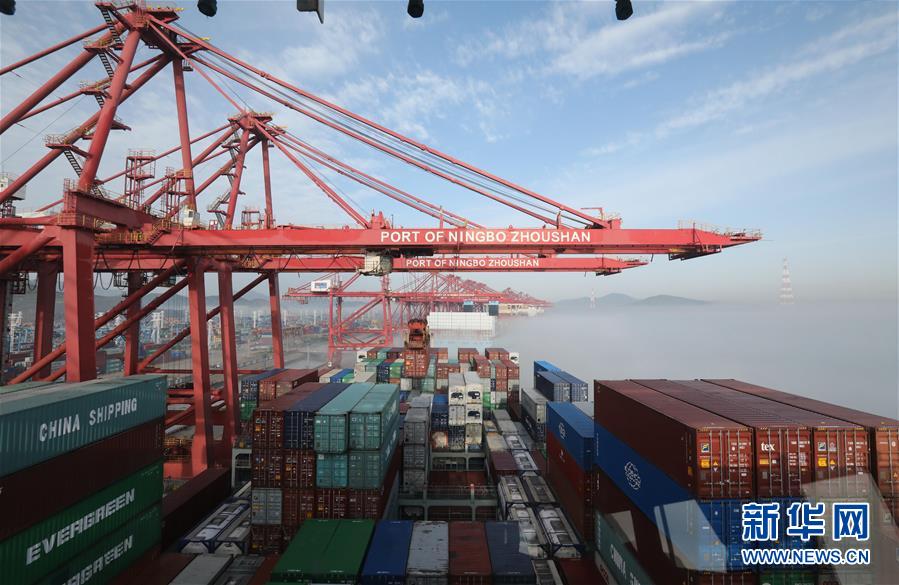 4月18日,在浙江宁波舟山港,“中远荷兰”轮在装卸货物。新华社记者闫亮 摄