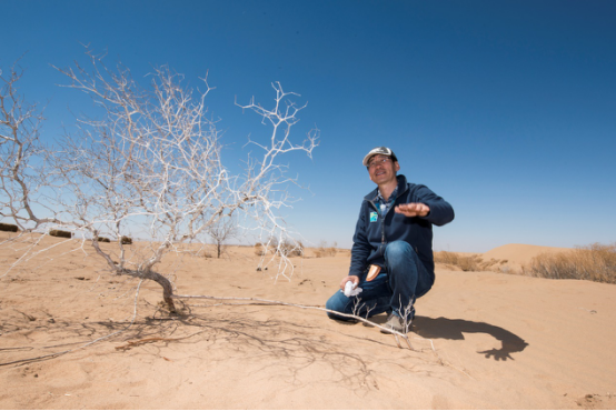 锁边林生态公益项目基地负责人吴向荣老师正为大家讲解沙漠植物——沙拐枣,其根系可长达25米。